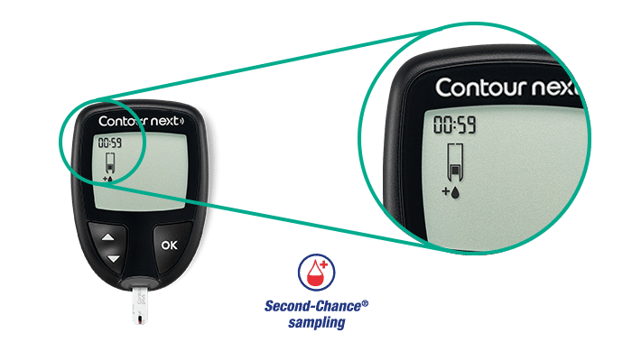 CONTOUR®NEXT har en 60 sekunders nedtællingsskærm, så du har mulighed for at tilføre mere blod til den samme teststrimmel, hvis der ikke blev tilført blod nok første gang.